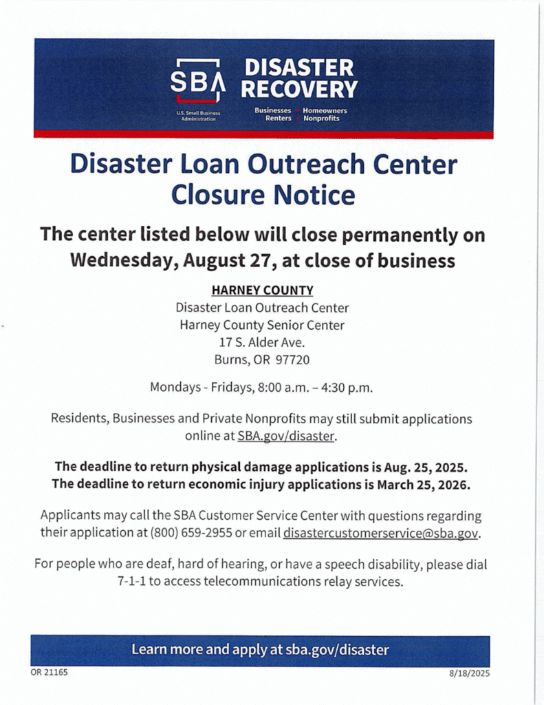 BURNS – The Small Business Administration’s Disaster Loan Outreach Center in Harney County will be closing down soon. According to a release from the SBA, the Disaster Loan Outreach Center located at the Harney County Senior Center will close permanently on Wednesday, August 27th.
