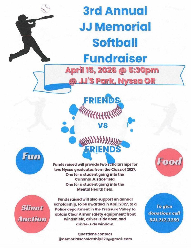 In addition, the third annual JJ Memorial Softball Fundraiser will take place at 5:30 p.m., in support of two scholarships for Nyssa High School graduates. Find details below: