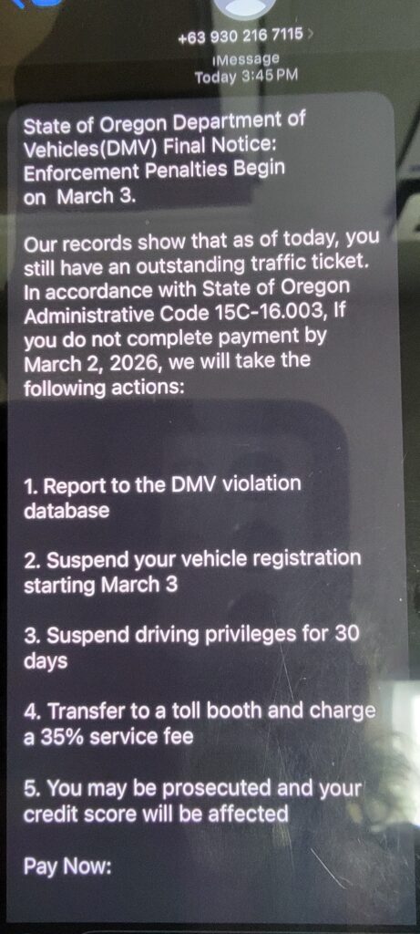 ONTARIO – The Ontario Police Department (OPD) is reporting another round of DMV Scam/impersonation texts being circulated. Like previous scams, these texts claim to be from the State of Oregon Department of Motor Vehicles (DMV), claim the victim is late on some form of outstanding payment or fine, and threaten immediate penalties or restrictions if payment is not provided by a short deadline.