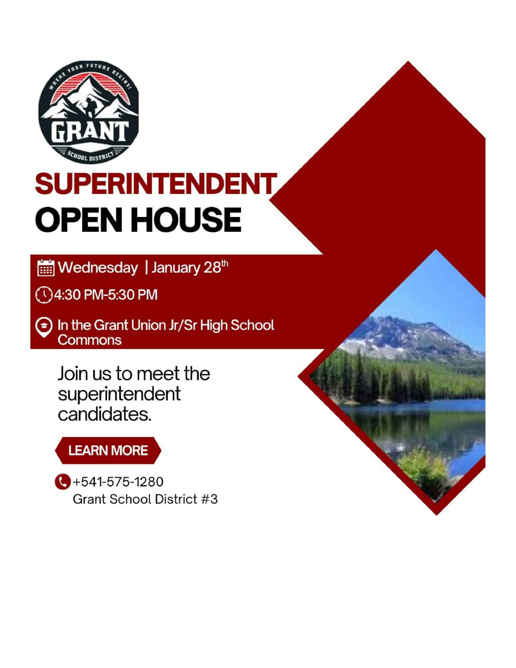 Grant School District will be hold an superintendent open house Wednesday, January 28th 2026 from 4:30PM to 5:30PM in the Grant Union Jr/Sr High School Commons. Join us to meet the superintendent candidates. Learn more at Grant School District #3, 541-575-1280.