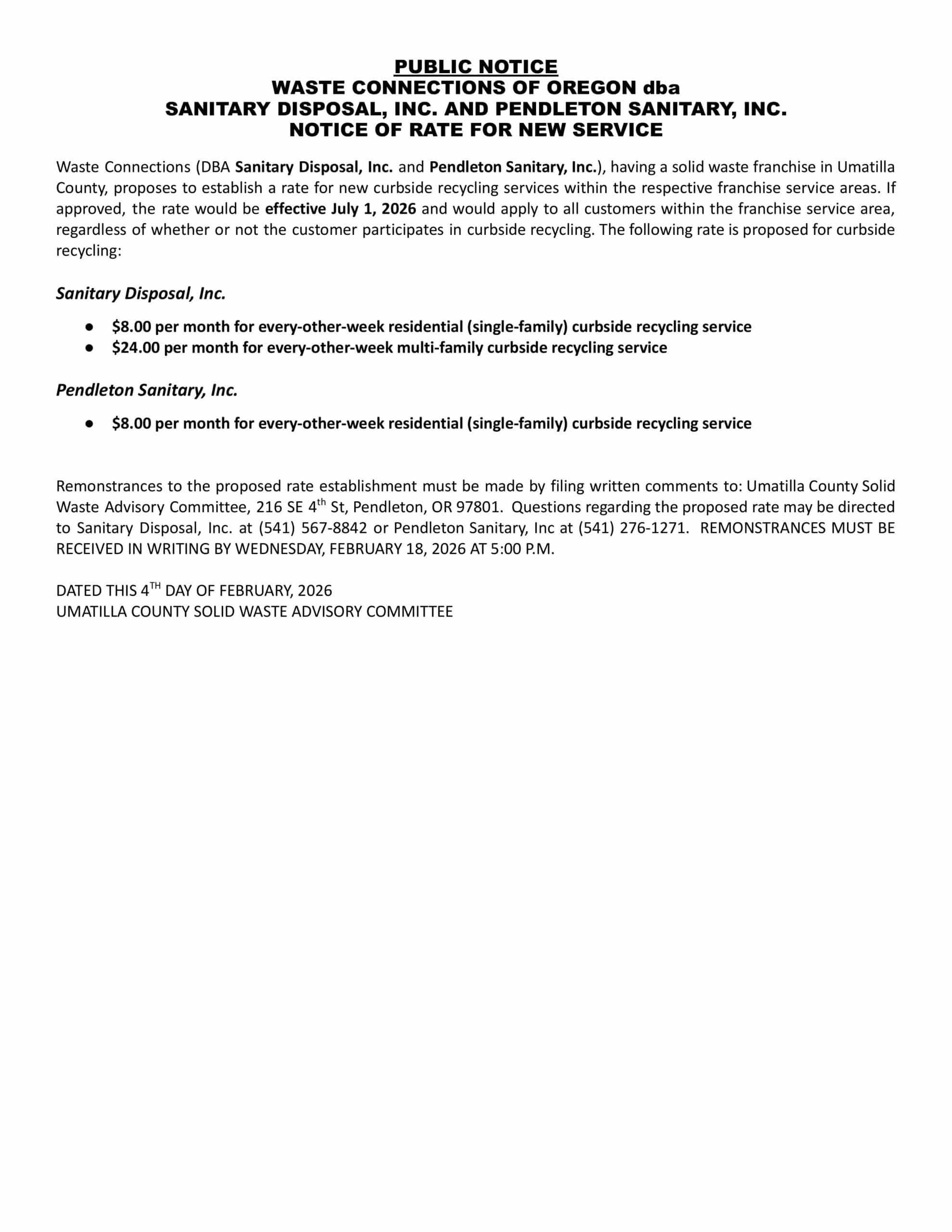 PUBLIC NOTICE WASTE CONNECTIONS OF OREGON dba SANITARY DISPOSAL, INC. AND PENDLETON SANITARY, INC. NOTICE OF RATE FOR NEW SERVICE Waste Connections (DBA Sanitary Disposal, Inc. and Pendleton Sanitary, Inc.), having a solid waste franchise in Umatilla County, proposes to establish a rate for new curbside recycling services within the respective franchise service areas. If approved, the rate would be effective July 1, 2026 and would apply to all customers within the franchise service area, regardless of whether or not the customer participates in curbside recycling. The following rate is proposed for curbside recycling: Sanitary Disposal, Inc. ๏ท $8.00 per month for every-other-week residential (single-family) curbside recycling service ๏ท $24.00 per month for every-other-week multi-family curbside recycling service Pendleton Sanitary, Inc. ๏ท $8.00 per month for every-other-week residential (single-family) curbside recycling service Remonstrances to the proposed rate establishment must be made by filing written comments to: Umatilla County Solid Waste Advisory Committee, 216 SE 4 th St, Pendleton, OR 97801. Questions regarding the proposed rate may be directed to Sanitary Disposal, Inc. at (541) 567-8842 or Pendleton Sanitary, Inc at (541) 276-1271. REMONSTRANCES MUST BE RECEIVED IN WRITING BY WEDNESDAY, FEBRUARY 18, 2026 AT 5:00 P.M. DATED THIS 4 TH DAY OF FEBRUARY, 2026 UMATILLA COUNTY SOLID WASTE ADVISORY COMMITTEE