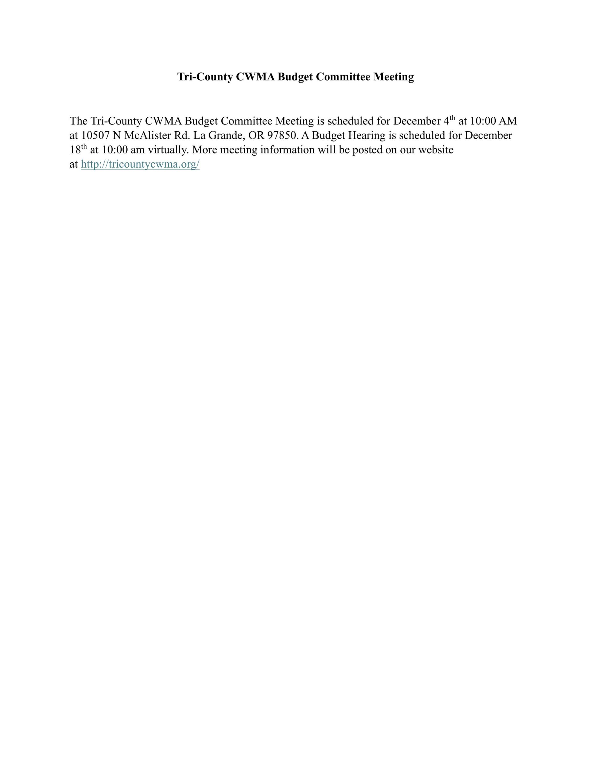 The Tri-County CWMA Budget Committee Meeting is scheduled for December 4th at 10:00 AM at 10507 N McAlister Rd. La Grande, OR 97850. A Budget Hearing is scheduled for December 18th at 10:00 am virtually. More meeting information will be posted on our website at http://tricountycwma.org/”
