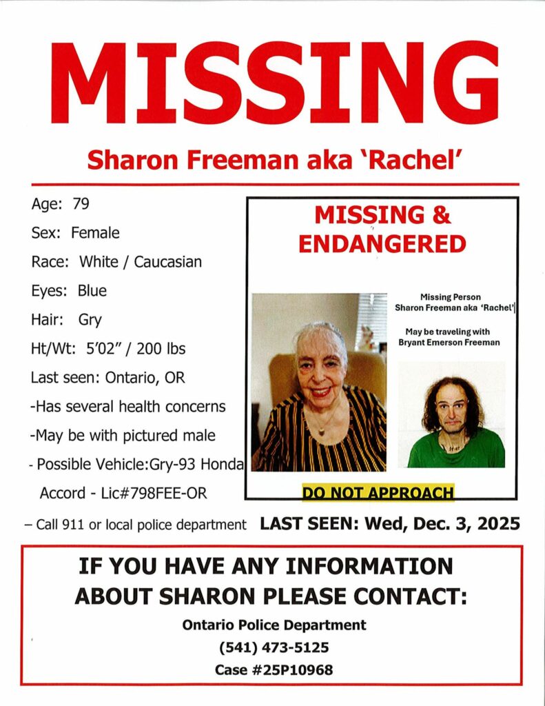 ONTARIO – The Ontario Police Department have released information regarding a missing personโSharon Freeman aka โRachelโโlast seen December 3rd. Find the information below, and contact Ontario Police at (541) 473-5125 if you have information as to her whereabouts.