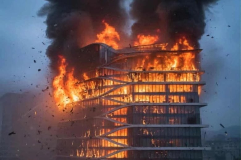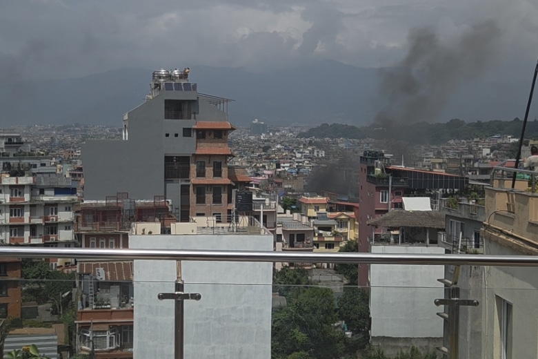 Below: (1) Smoke from the beginning of the demonstration as seen from Baty’s hotel (2) The Hilton Hotel in Kathmandu in flames