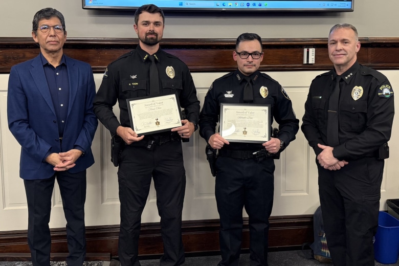 Mayor Gustavo Reyna presented the Life Saving Award and the Award of Valor during the Feb. 11 meeting, highlighting two separate incidents where local law enforcement ignored personal peril to rescue trapped citizens and confront an active shooter.